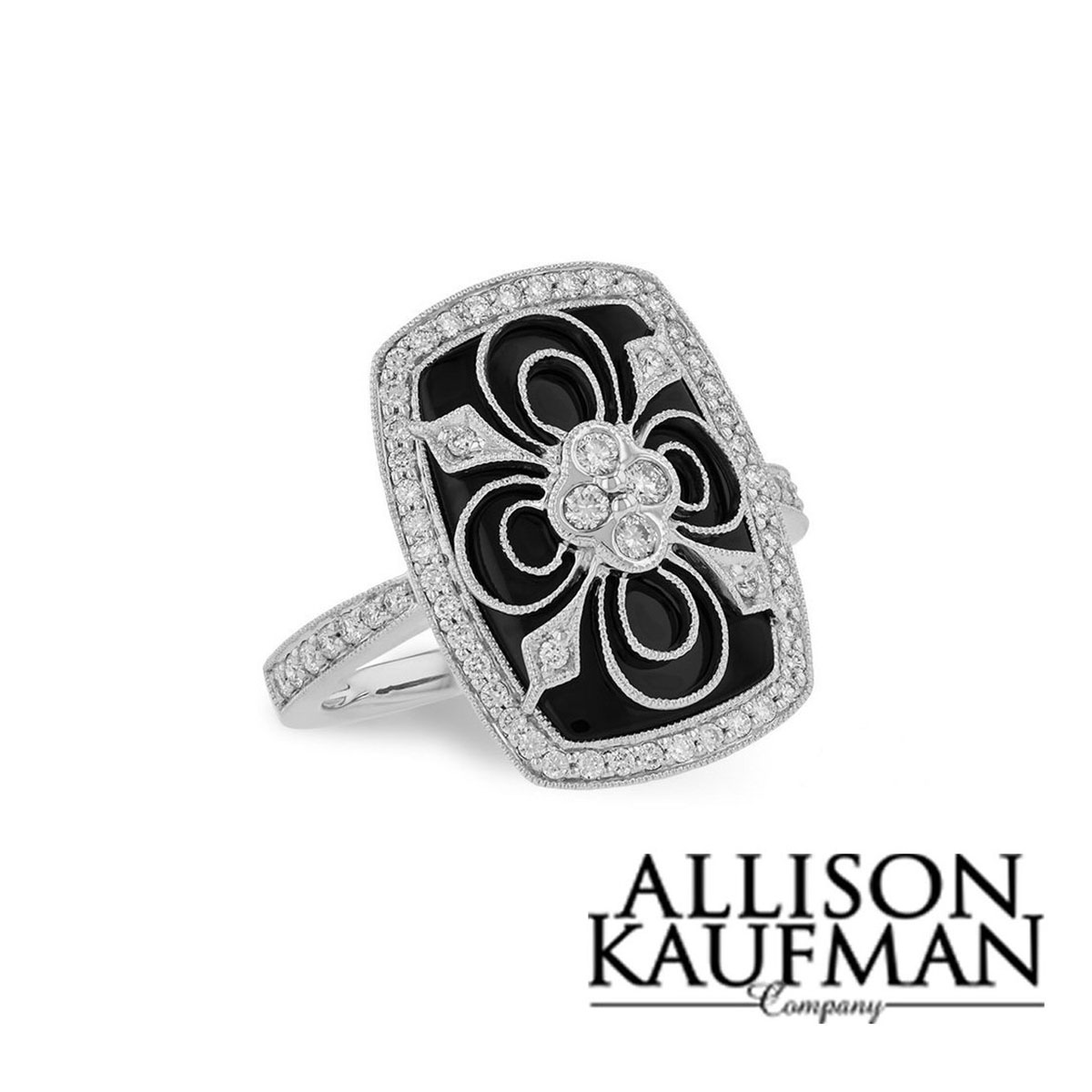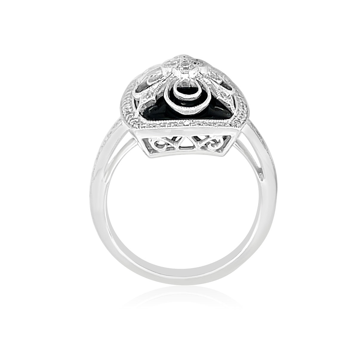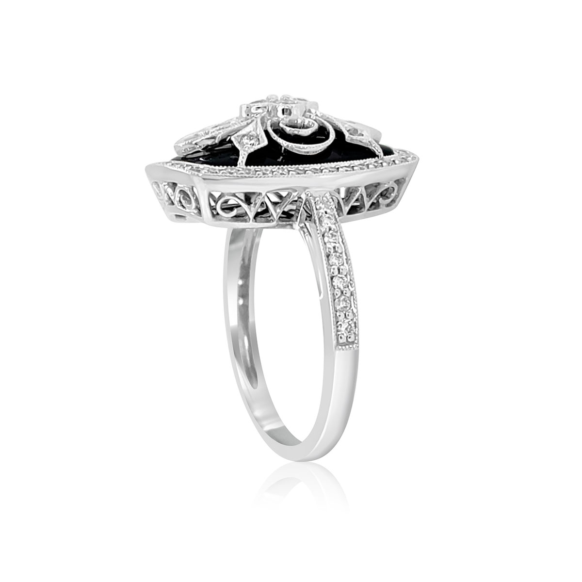 Classic vintage elegance. 14 karat white gold diamond and onyx ring. There is a rectangular onyx set under a vintage style floral design. There are round brilliant cut diamonds within and around the design in a halo, and down the sides of the band, totaling 0.44 cttw.