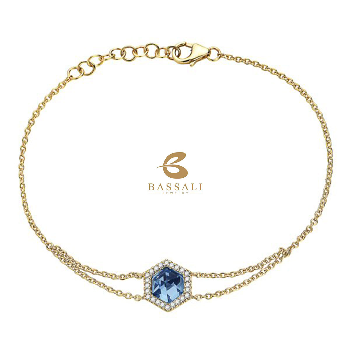 Simple and pretty 14 karat yellow gold Swiss blue topaz and diamond bracelet. The centerpiece of the bracelet is a 1.43ct hexagon cut Swiss blue topaz. There are 0.12cttw round brilliant cut diamonds, prong set around the topaz. This gorgeous bracelet was created by Bassali Jewelry.