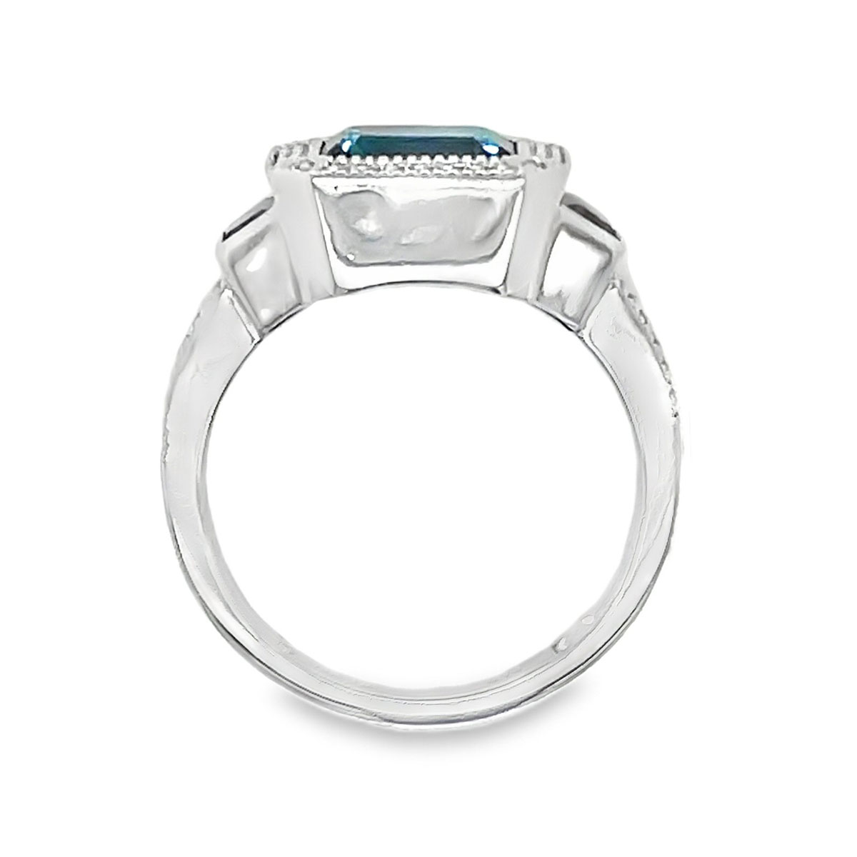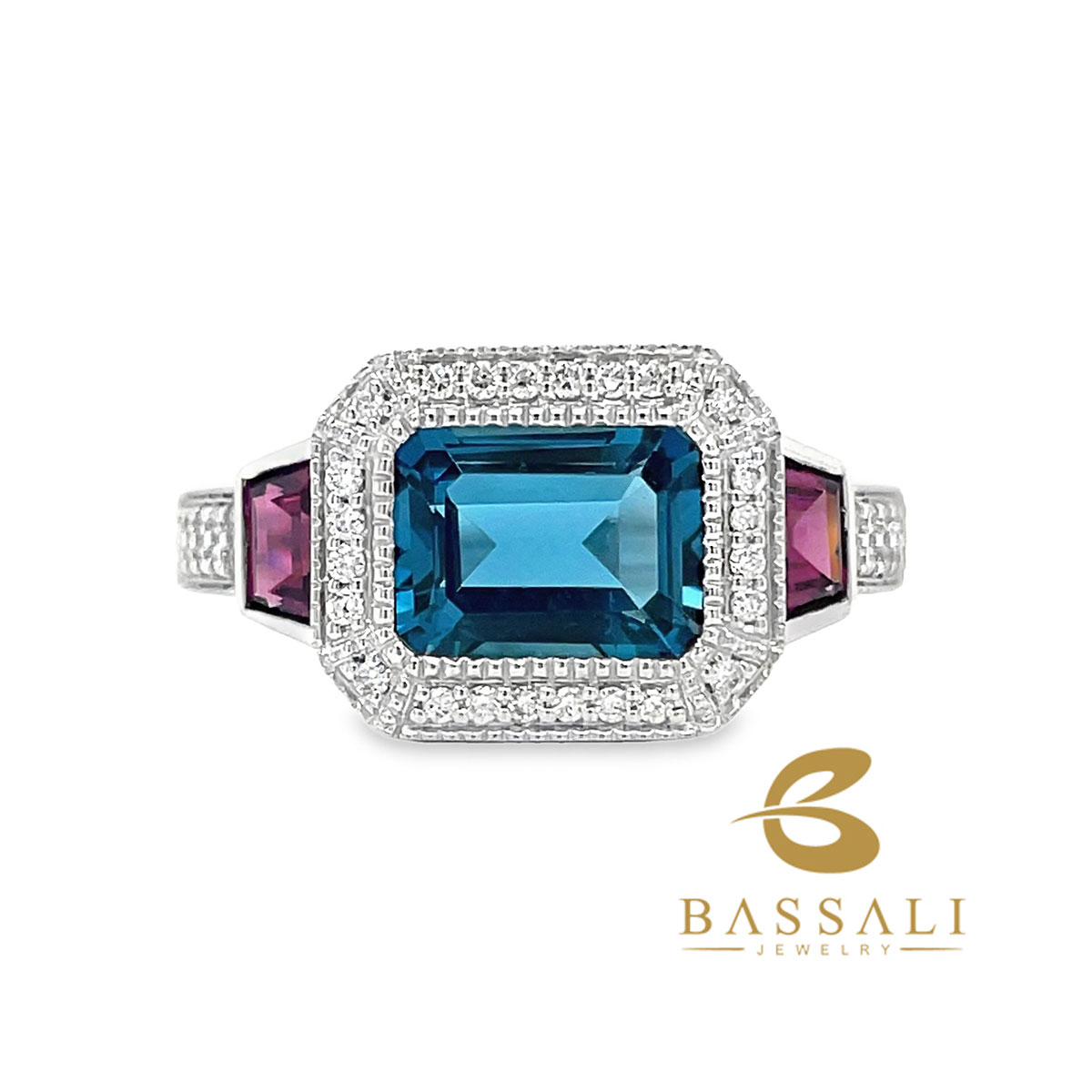 14 karat white gold blue topaz, garnet and diamond ring. The 1.76ct emerald cut London blue topaz is bezel set east-west. There are round brilliant cut diamonds surrounding the stone with milgrain edging. There are also bead set diamonds on both sides of the ring. In between the 0.19cttw diamonds, is a trapezoid cut rhodolite garnet. The 0.54cttw garnets are also bezel set.