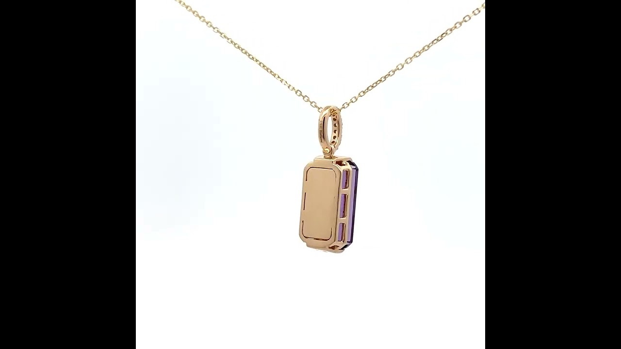 Exquisite charm necklace featuring a deep purple 3.77 carat amethyst gemstone, meticulously cut in an emerald shape with 0.29 cttw diamonds set under the amethyst, and going up the bail. The rich hue of the amethyst is beautifully complemented by the warm glow of the yellow gold setting, suspended elegantly on a delicate gold chain. This piece exudes understated elegance.