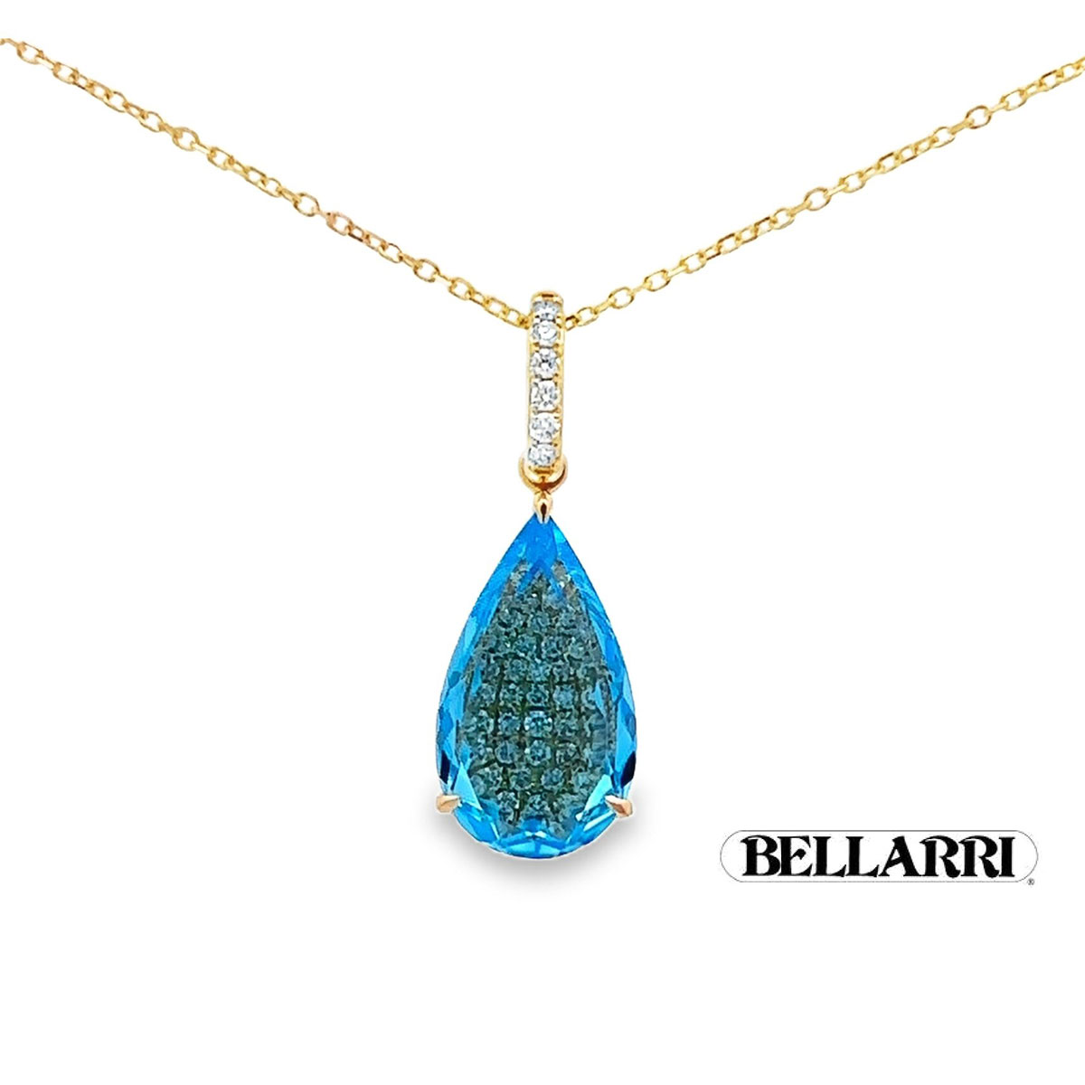Elevate your style with this exquisite charm necklace, showcasing a mesmerizing 3.41 carat pear-shaped Swiss blue topaz. The brilliantly cut gemstone with 0.22cttw diamonds behind it, is suspended from a delicate yellow gold chain, with diamonds on the bail creating a sophisticated and eye-catching accessory. Its vibrant color and impeccable craftsmanship make it a timeless addition to any jewelry collection.