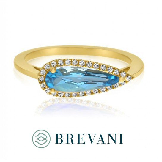Unique 14 karat yellow gold pear shaped blue topaz surrounded by diamonds set east to west for a surprisingly asymmetrical look. The 1.1 carat pear shaped blue topaz is surrounded by 0.08cttw round brilliant cut diamonds.