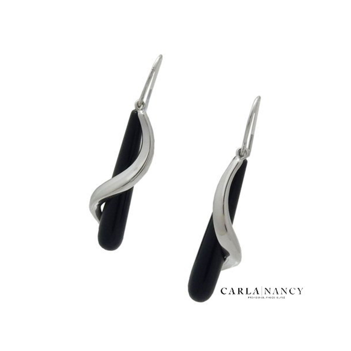Really cool elongated onyx earrings with sterling silver spiraling around it. The sterling silver has been rhodium plated to be hypo-allergenic and tarnish free. Made in the USA. Made by Carla B.