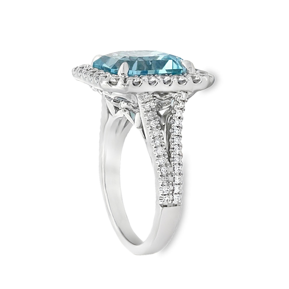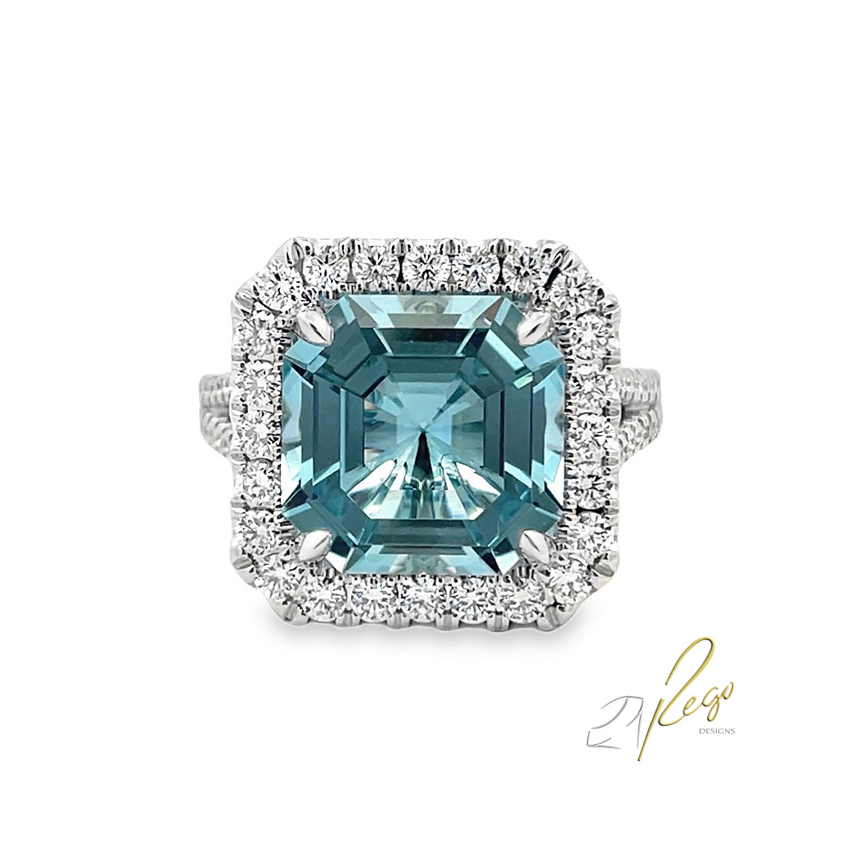 One of a kind 14 karat white gold, aquamarine and diamond ring by Rego Designs with a 5.81ct modified asscher cut aquamarineand 0.87cttw diamonds.