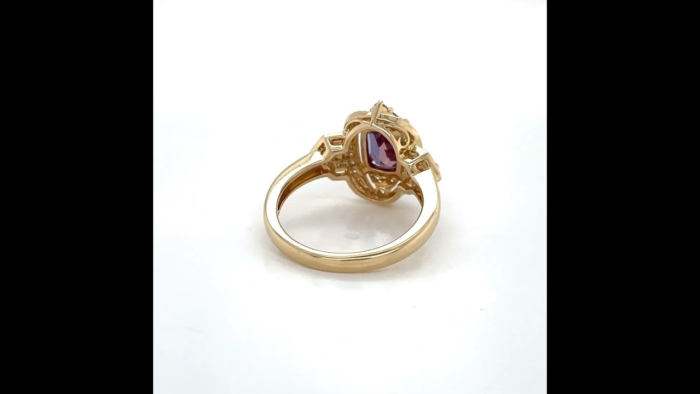 One of a kind 14 karat yellow gold created alexandrite and diamond ring. The centerpiece of the ring is a 2.0ct antique cushion cut lab grown alexandrite with perfect color change. It is accented beautifully with .45cttw round brilliant cut diamonds of VS clarity and F-G color.