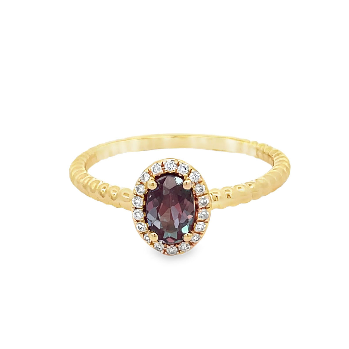 This stunning 14 karat yellow gold, created alexandrite and diamond ring features a captivating 0.52 carat created alexandrite at its center, surrounded by a halo of 0.07cttw sparkling diamonds.