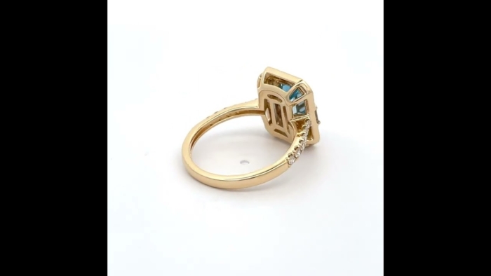 This stunning 14 karat yellow and white gold, aquamarine ring is the epitome of elegance and sophistication. The centerpiece of this ring is a radiant 1.23 carat emerald cut aquamarine, surrounded by 0.11cttw baguette cut and 0.34cttw round brilliant cut diamonds.