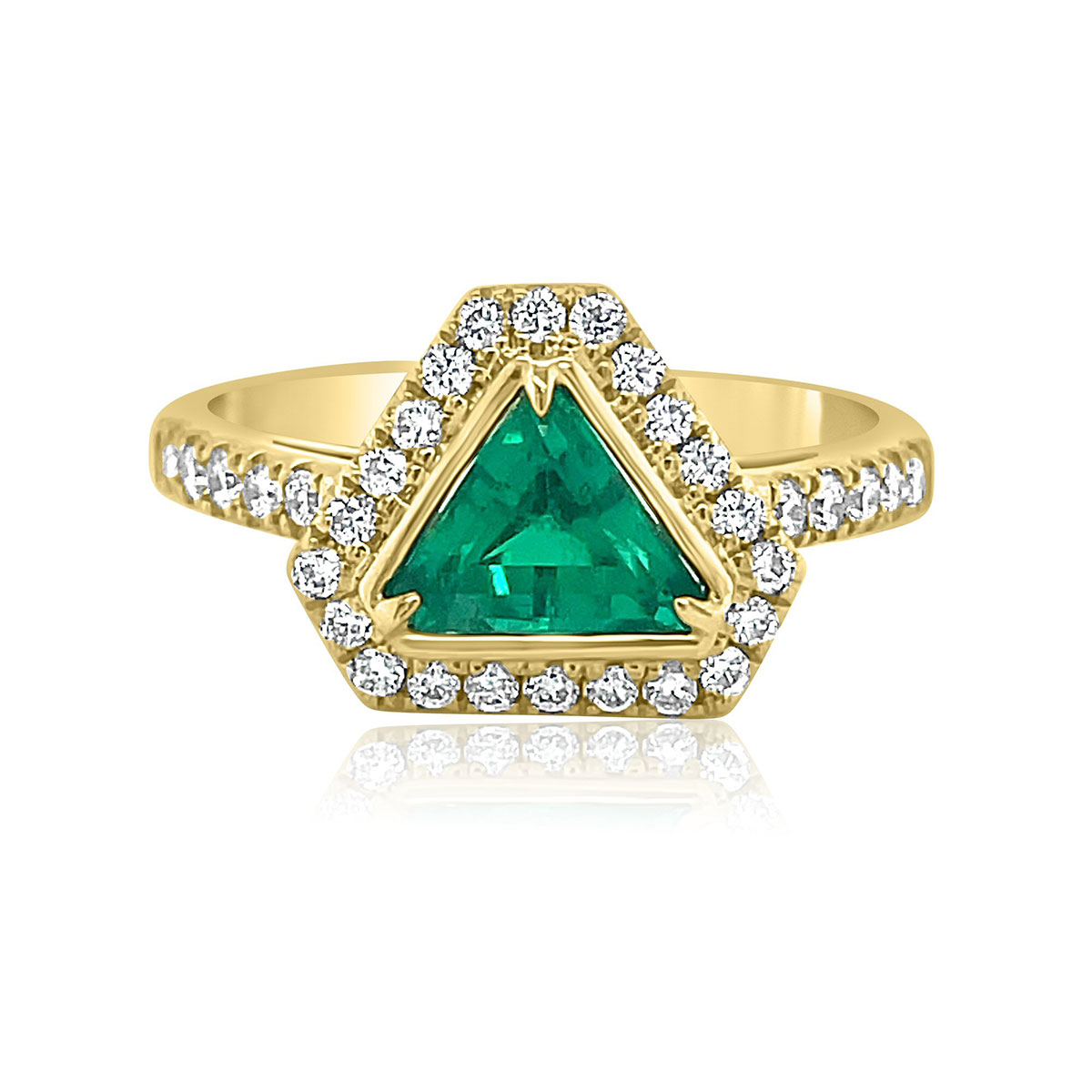 One of a kind 14 karat yellow gold emerald and diamond ring. The .73 carat fancy triangle cut, vibrant green emerald is prong set with a halo of diamonds. The band is set with diamonds, set partially down each side. The .33 cttw round brilliant cut diamonds are SI clarity and G-H in color.