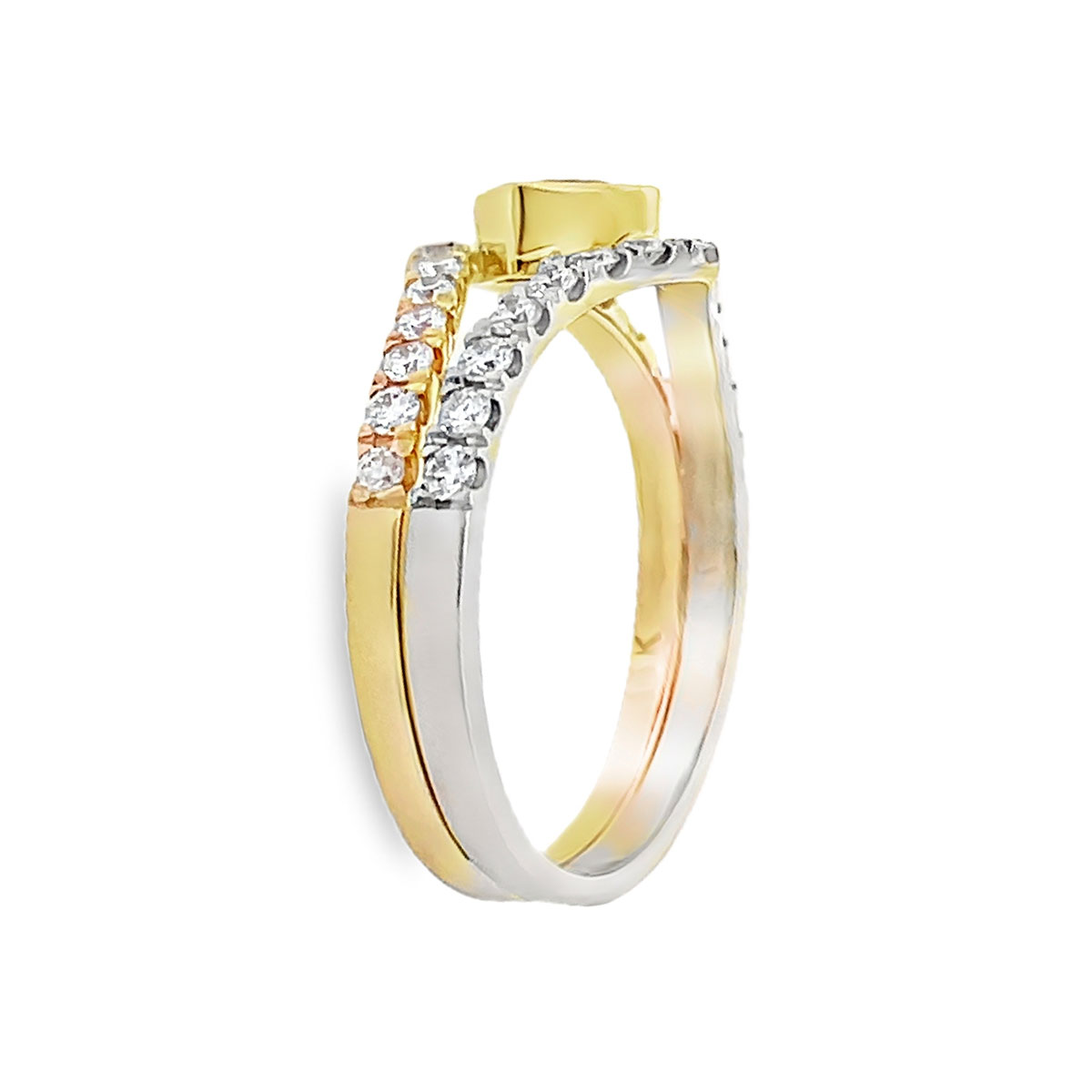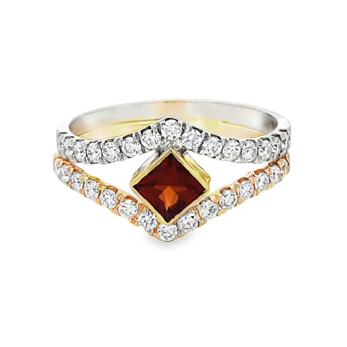 One of a kind 14 karat white and yellow gold garnet and diamond ring. The centerpiece of the ring is a 0.50ct square-cut Mozambique garnet that is diagonally bezel-set in yellow gold. On either side of the garnet is one yellow gold and one white gold “Chevron” style band with 0.24cttw diamonds in each band.
