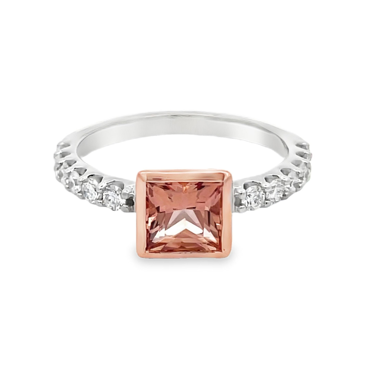 14 karat rose and white gold Imperial Topaz ring. The 1.01 carat princess cut Imperial topaz in bezel set in rose gold. Prong set on either side of this gorgeous stone are .43cttw round brilliant cut diamonds of SI clarity and F+ color.