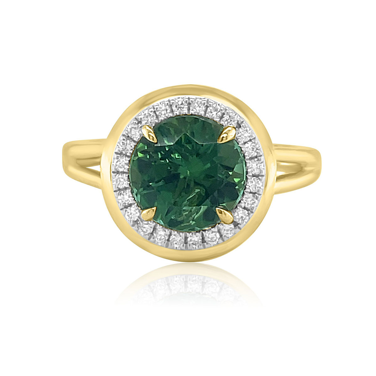 Dazzling 14 karat yellow gold green tourmaline and diamond ring. The 1.98 carat round brilliant cut green tourmaline is prong set with a halo of diamonds. The .12 cttw round brilliant cut diamonds are SI clarity and G-H in color.