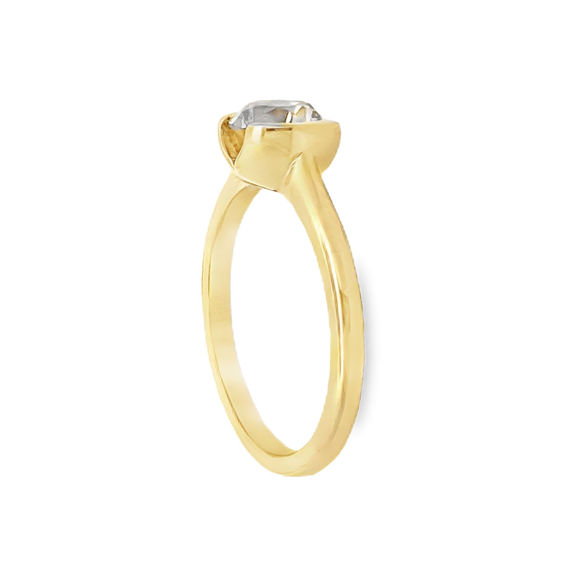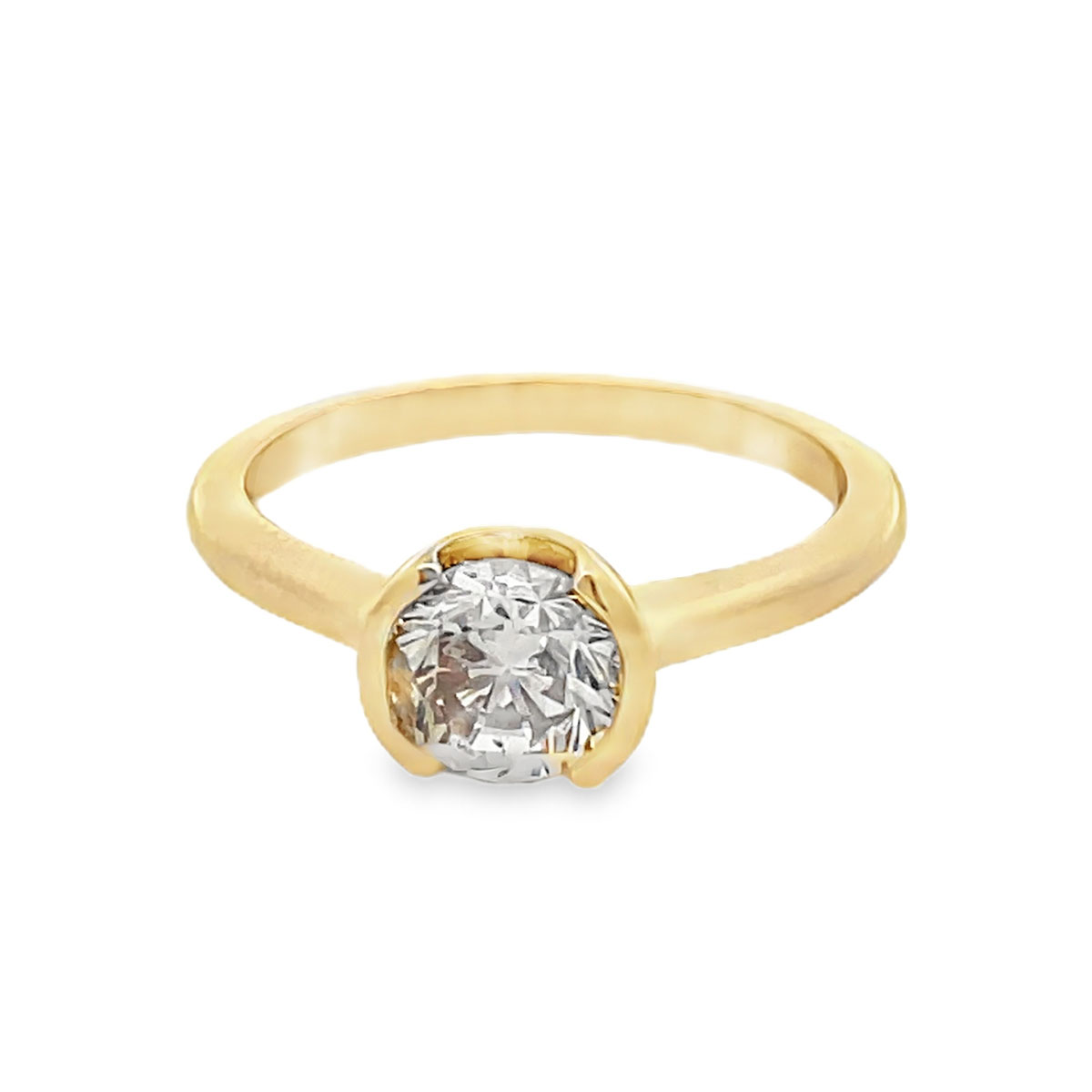 14 karat yellow gold 1.07 carat round brilliant cut diamond ring. The 1.07 carat diamond is I2 clarity and S-T in color which looks like light chocolate. It is set in a half bezel and is certified by Gemological Institute of America, certificate #2235045888. A really pretty, contemporary ring at a great price!
