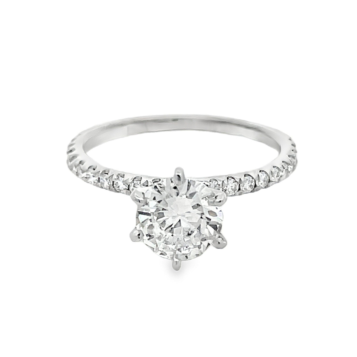 14 karat white gold 1.31cttw diamond engagement ring. The center stone is a 1.10 carat round brilliant cut diamond of SI2 clarity and I color, It is certified as such by the Gemological Institute of America, certificate #5222448435. On either side of the center diamond is .21cttw prong set round brilliant cut diamonds of SI clarity and G color.