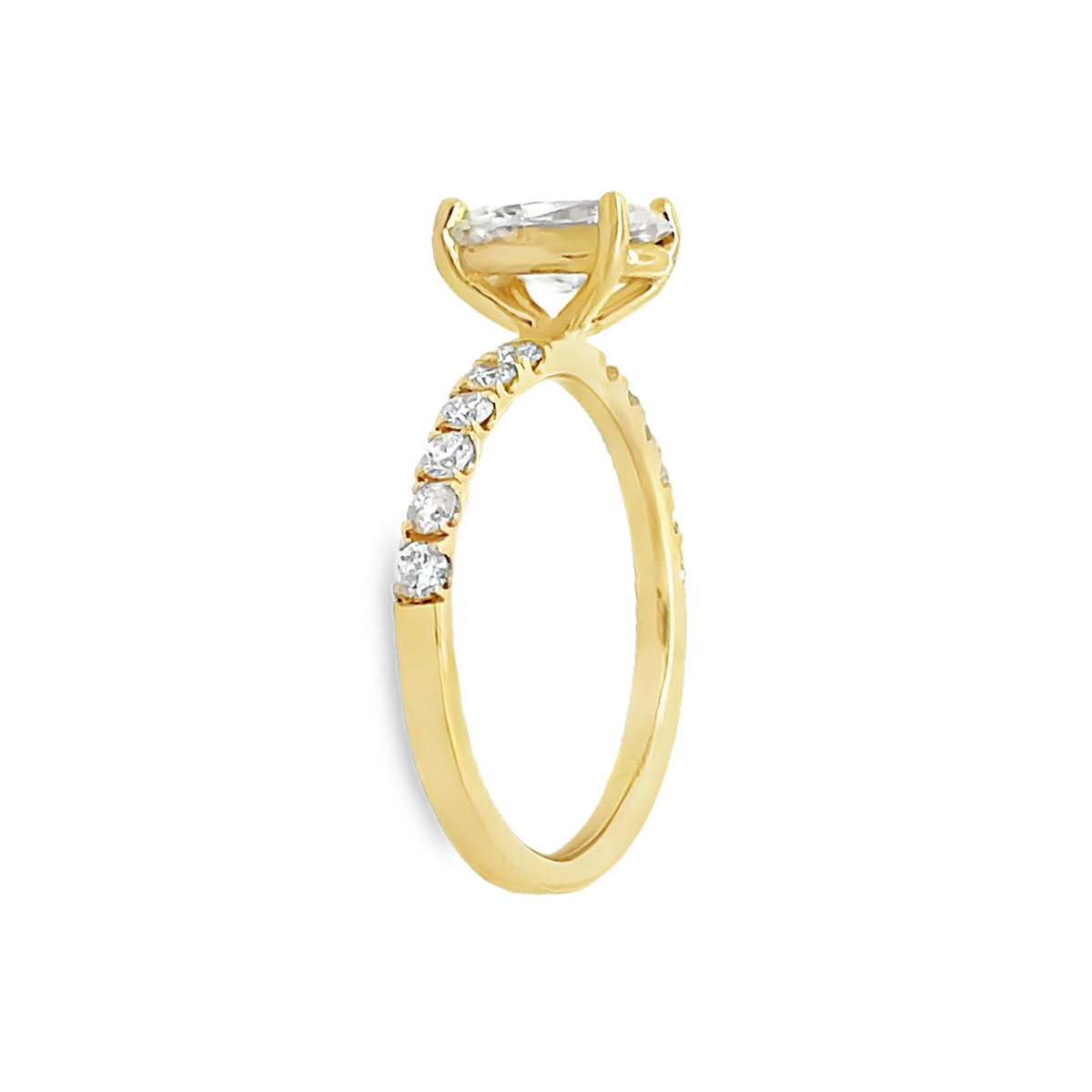 14 karat yellow gold 1.44cttw diamond engagement ring. The center diamond is a 1.11 carat oval diamond of SI2 clarity and J color and is certified as such by Gemological Institute of America, certificate #1236262168. Beautiful proportions and cut. There are 0.34cttw round brilliant cut diamonds on both sides of the center stone. The center diamond may be purchased separately for $5,500.
