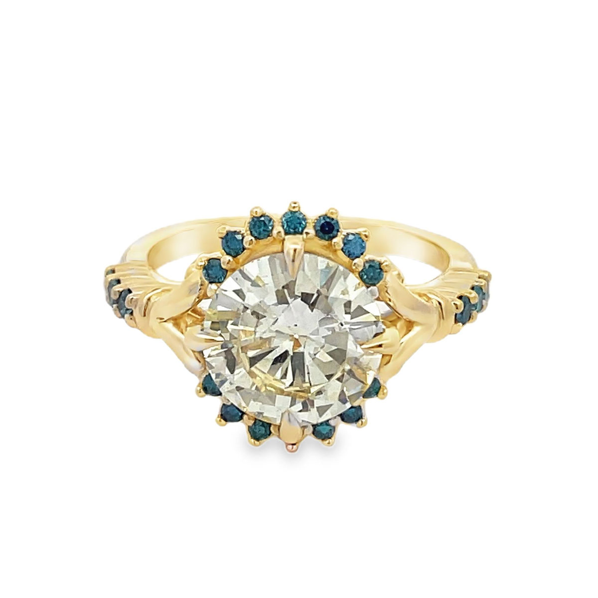 14 karat yellow gold 2.86cttw diamond ring. The centerpiece of the ring is a stunning 2.59 carat round brilliant cut diamond. While it is certified by Gemological Institute of America as I1 clarity and S-T color, it is only I1 due to the size of the stone. The color is a beautiful pale yellow-green that is highlighted with 0.27cttw round brilliant cut diamonds that have been irradiated teal blue.