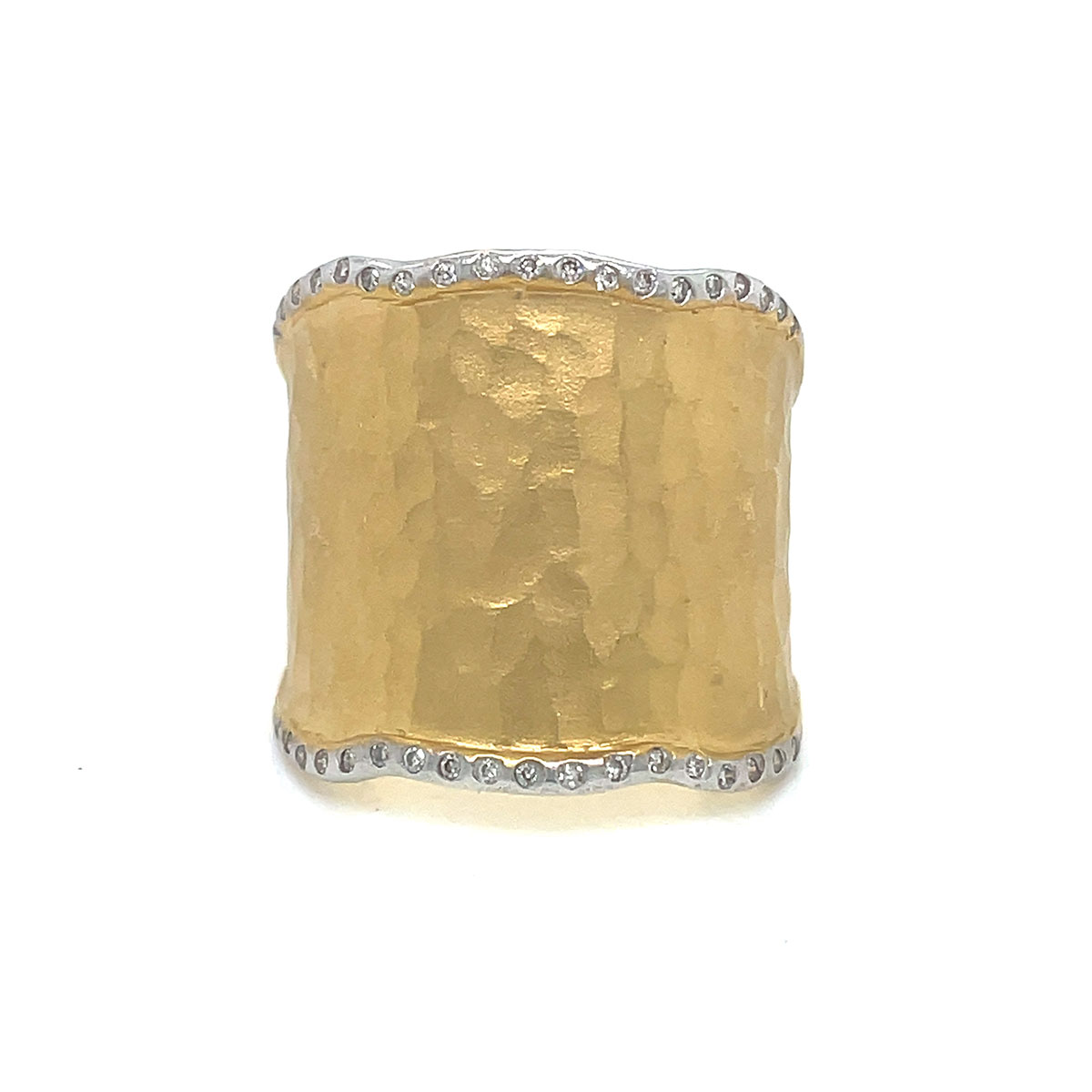 14 karat yellow gold cigar band with 0.25cttw round brilliant cut diamonds prong set on the outside rims. Tapered from 19mm down to 7mm. Soft hammered finish. Round brilliant cut diamonds are SI clarity and H-I color.