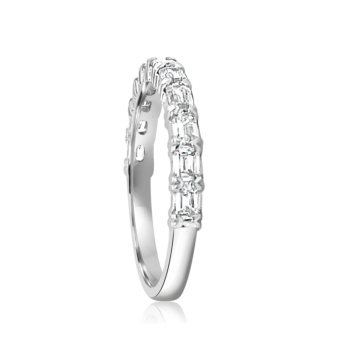 14 karat white gold band with 0.75 cttw baguette cut diamonds, set east-west.