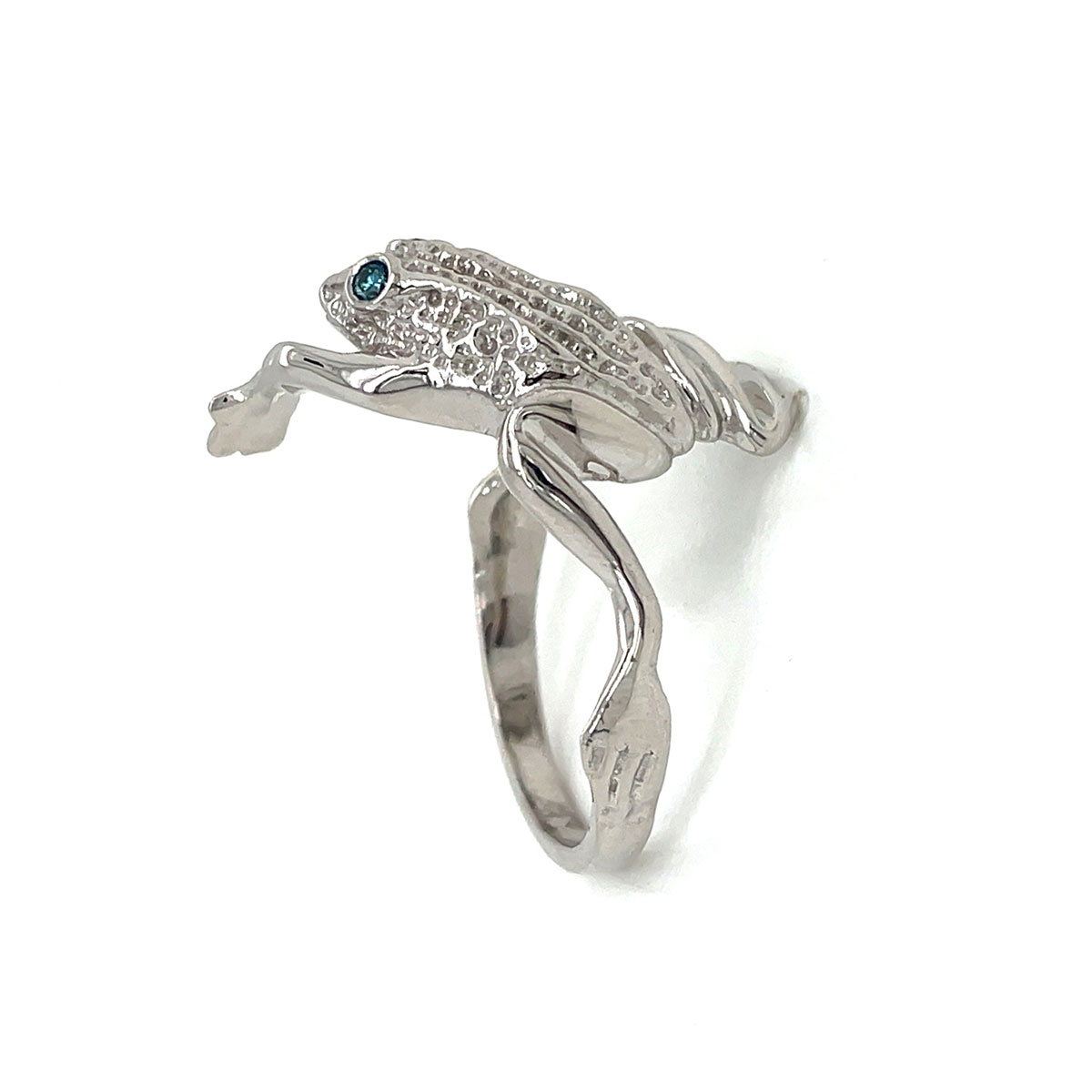 Can be created in white gold with .06cttw irradiated teal diamond eyes.