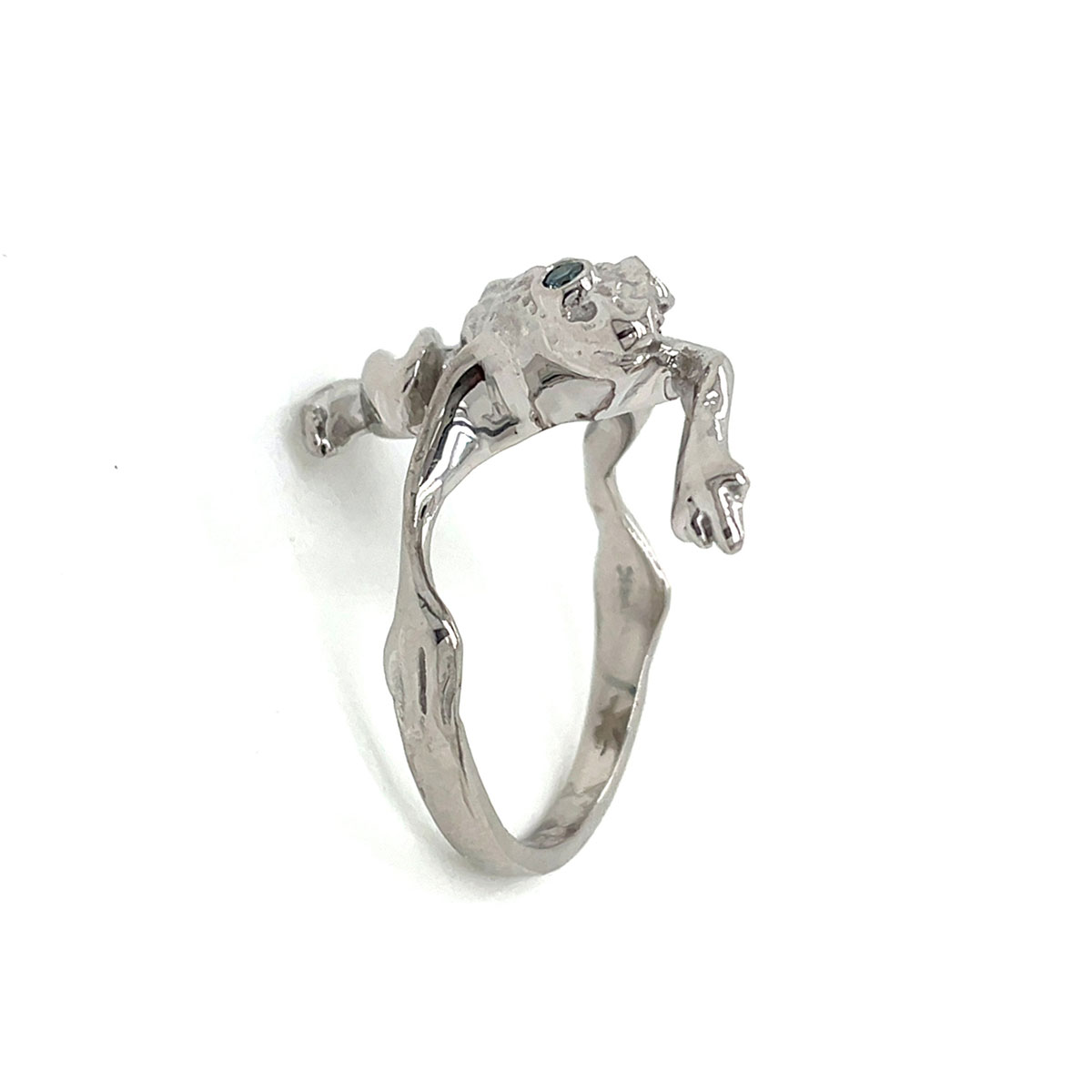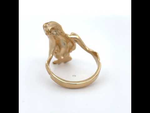 Adorable 14 karat yellow gold frog ring that cuddles your finger. It has .07cttw irradiated green diamond eyes. Made by Gold In Art jewelers.